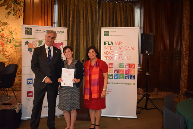 Le 29 juin, trois tables-rondes ont permis de présenter les avancées de quelques pays en matière de sensibilisation et plaidoyer. La première table-ronde "Celebrating successes in raising awareness" était modérée par Glòria Pérez-Salmerón, avec des présentations de Raphaëlle Bats (France) et Elvira Lapuz (Philippines), et une discussion avec Thanos Giannakopoulos, le responsable de la bibliothèque de l'ONU, la Dag Hammarskjöld Library. Raphaëlle Bats a ainsi pu présenter devant un parterre de collègues du monde entier et de représentants de leurs ambassades à l'ONU les avancées du groupe français (Cfibd, BPI, ABF et Enssib) en faveur de la sensibilisation des bibliothécaires et documentalistes français et de la production d'outils de plaidoyer : base de données de témoignages, jeu de plateau, brochure. Outre cette mise en visibilité des actions françaises, le séminaire a été l'occasion de faire le bilan et de se saisir de nouveaux enjeux pour l'année à venir. A suivre, donc...